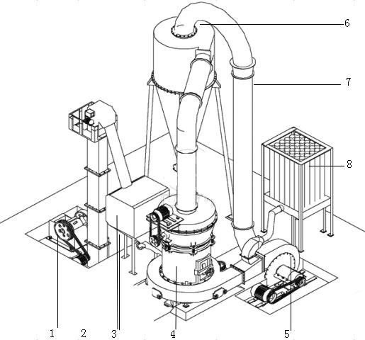 The whole structure of this machine consists of main engine, air blower ,size analyzer, cyclone collector , bag-type dust filter and pipeline,etc.which, if required,can be selectively equipped with elevator, electromagnetic vibrating feeder, crusher, electric cabinet, etc,. Having been crushed into the desired size ,and delivered to the hopper by bucket elevator, materials will be fed evenly and continuously by the vibrating feeder into the grinding chamber for powder-processing. Then the shovel scoops up the materials to the space between roller and ring,in which the grinding roller rotates itself as well as around the vertical axis, and then presses the grinding ring closely due to centrifugal force to accomplish the grinding. Fine powders will be carried to cyclone collector by the blower after analyzing, and then piped out as the finished products. Rough materials will be recycled into the grinding chamber by the air for regrinding. The materials may contain some moisture, and the pipeline joints are not absolutely airtight, therefore the external air might be sucked in , which will disturb the air circulation balance but can be achieved through adjusting air pipe between the air blower and the main engine. In this way, the superfluous air current will be channeled into the bag-type dust filter which will collect powder carried by the air and discharge the superfluous air after being purified.